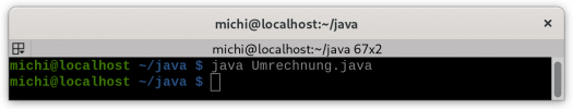 2. Der Aufruf "java Umrechnung.java" kann nicht klappen. Was Java in diesem Fall versuchen würde, wäre die Klasse "java" im Package "Umrechnung", also aus der Datei "Umrechnung/java.class" zu lesen und auszuführen. Eine *.java-Datei ist Quellcode, der Befehl "java" ruft aber die main-Methode in der passenden Klasse auf.